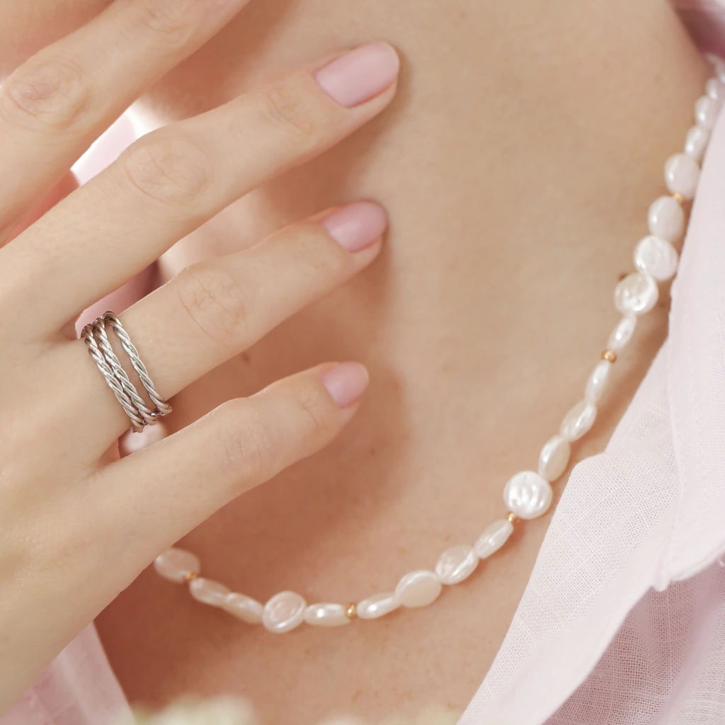 Quer dar um toque charmoso e diferenciado ao seu look? A Choker Pérola Bolachinha é a escolha perfeita! Com 12 bolachinhas de pérolas achatadas, intercaladas por miçangas douradas, essa gargantilha é puro charme e estilo.